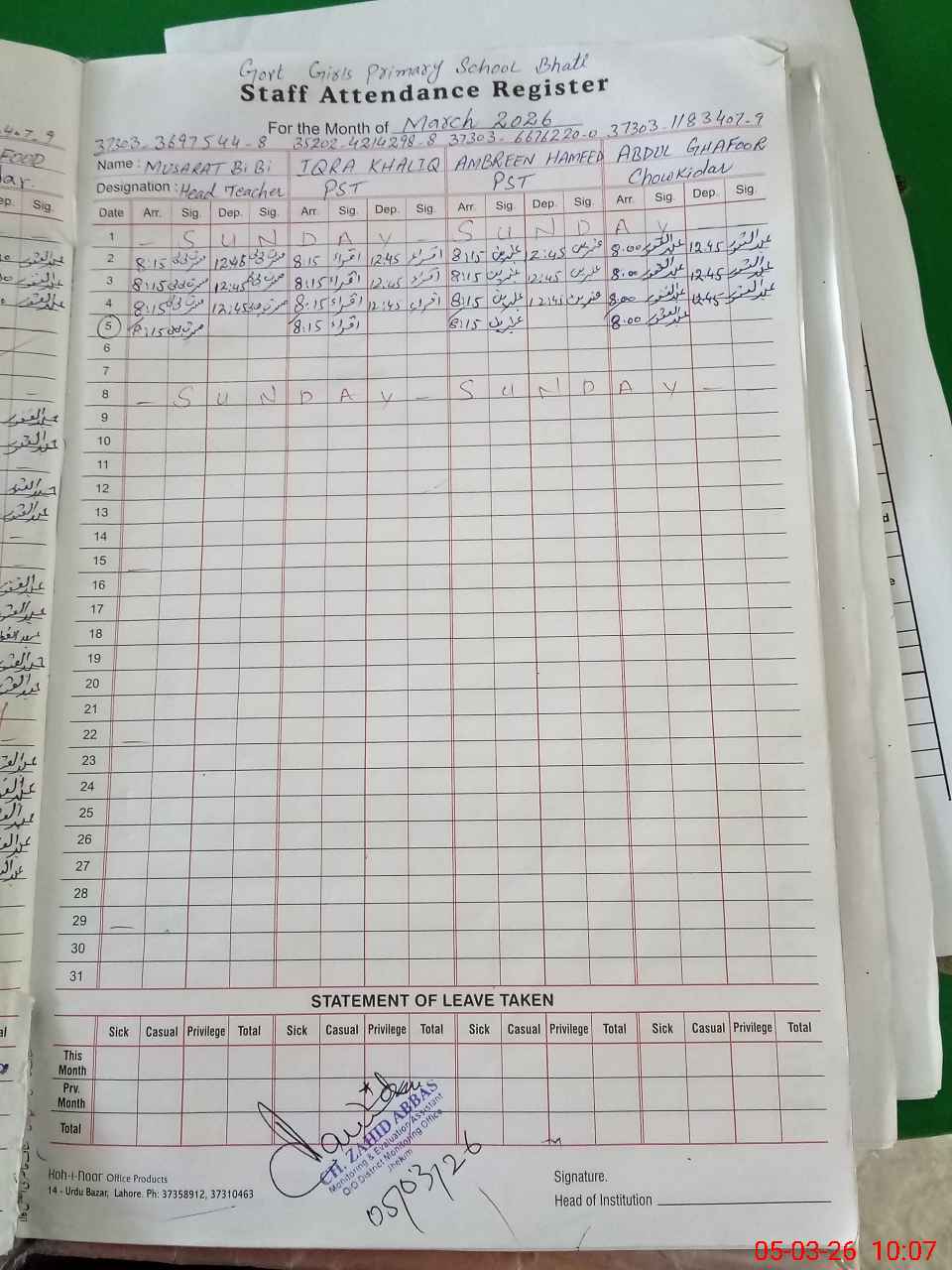 | Name: Mu**** Bi**** Designation: (School Headmaster's/Headmistress's) PST Phone/Cell Number: 03**** |