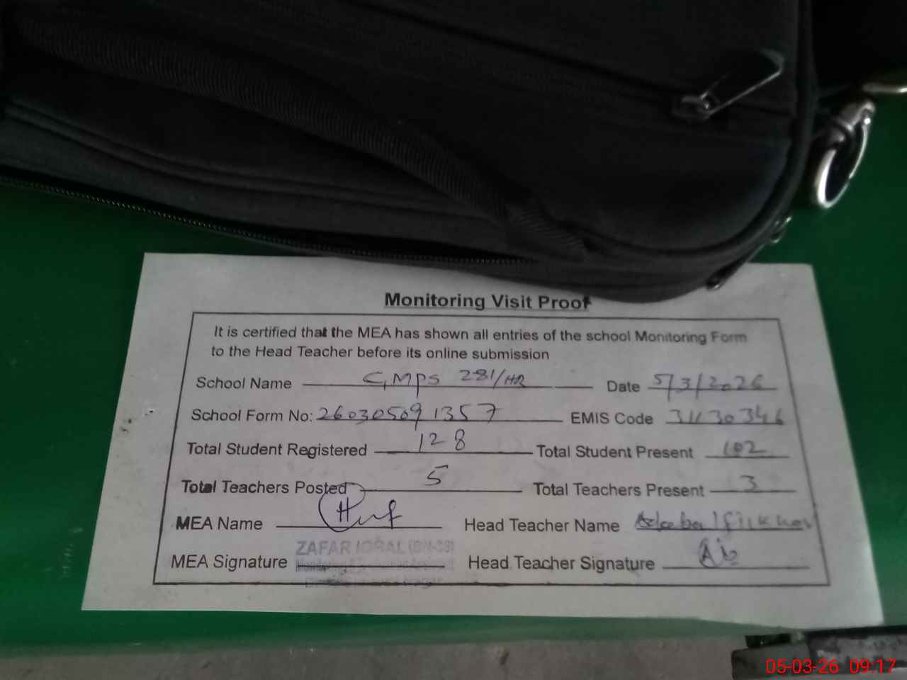 | Attendance Register | Head Teacher | MEA with School | Visit Proof |