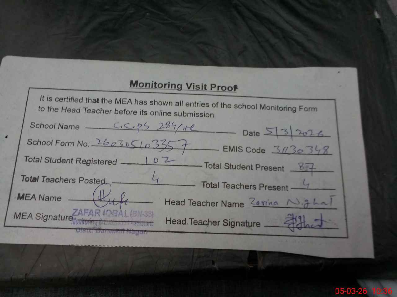 | Monitoring Date: 05-03-2026 | Start Time: 05-03-2026 10:25 AM | End Time: 05-03-2026 10:36 AM | Name of MEA: Za**** Iq**** BN**** | |