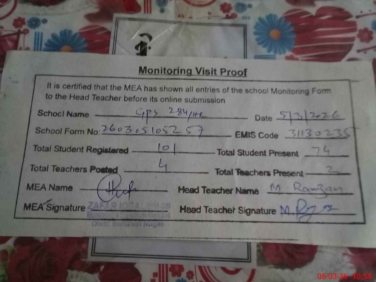 | Attendance Register | Head Teacher | MEA with School | Visit Proof |