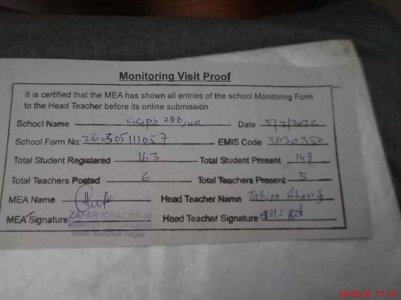 | Monitoring Date: 05-03-2026 | Start Time: 05-03-2026 11:00 AM | End Time: 05-03-2026 11:13 AM | Name of MEA: Za**** Iq**** BN**** | |