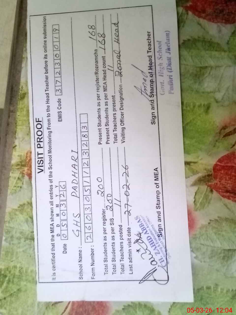 | Attendance Register | Head Teacher | MEA with School | Visit Proof |