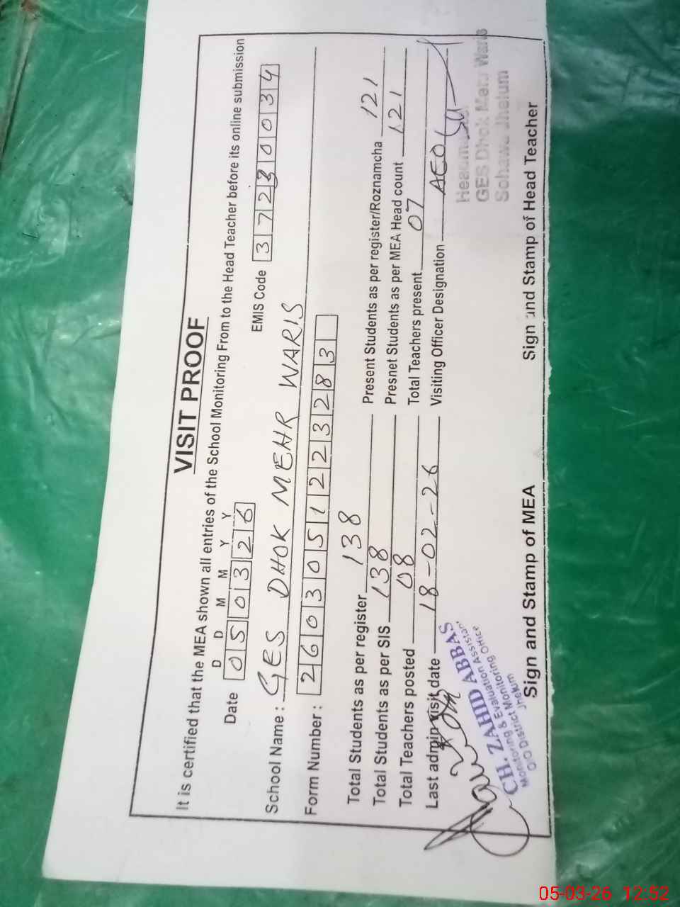 | EMIS Code: 37230034 | Name of School: GES DHOK MEHR WARIS | |||