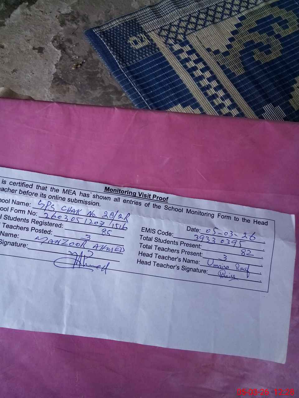 | EMIS Code: 39330395 | Name of School: GPS CHAK NO. 28/2-R | |||