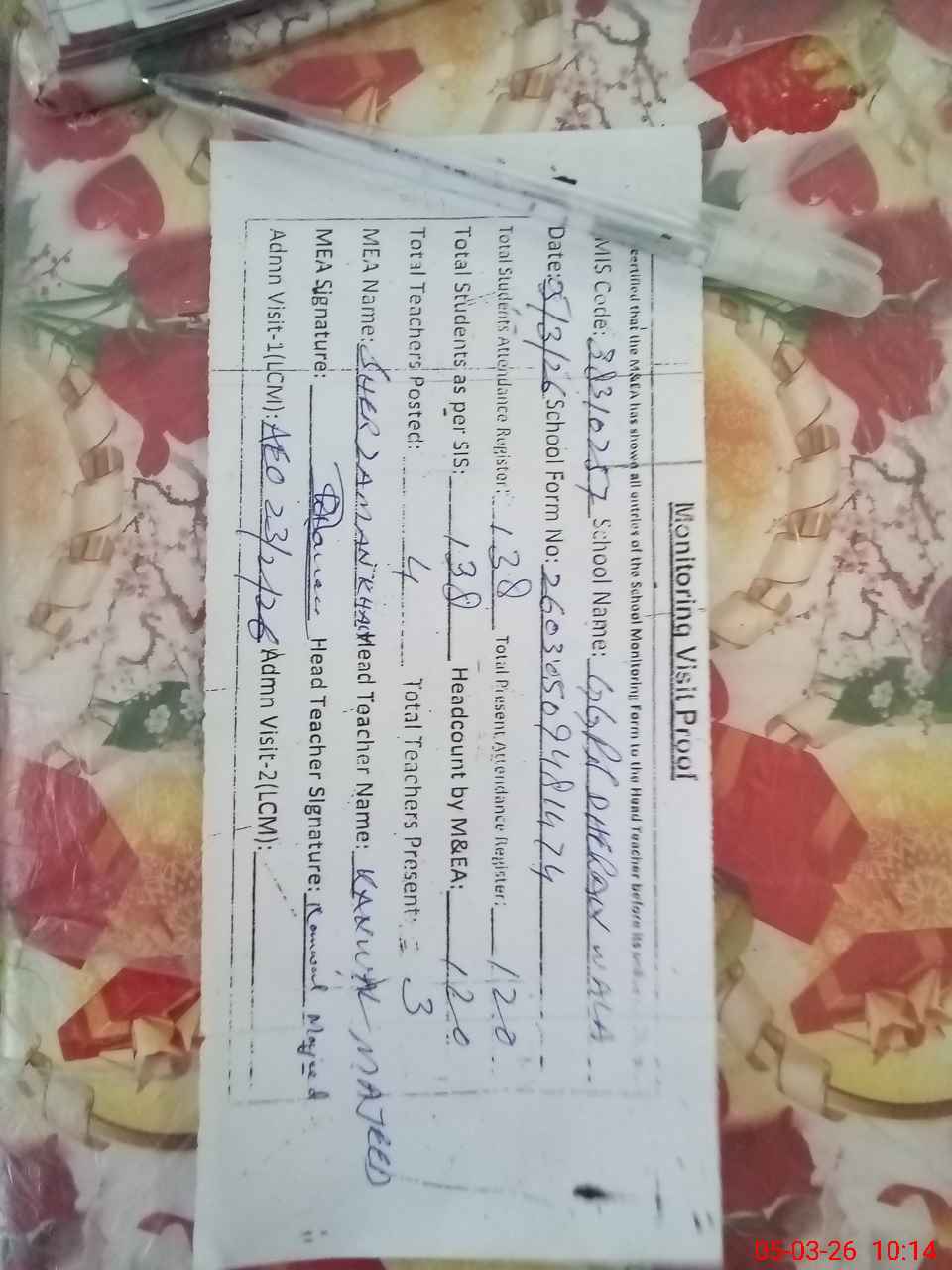 | Attendance Register | Head Teacher | MEA with School | Visit Proof |