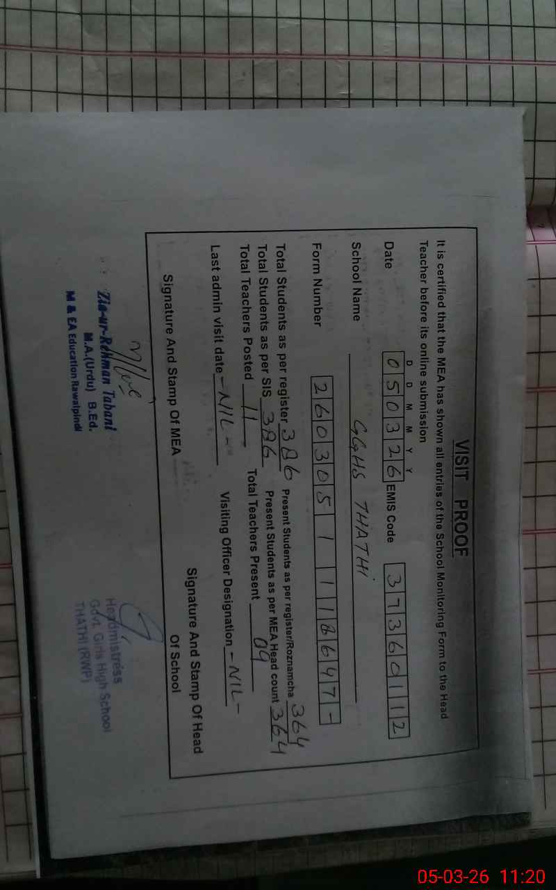 | Certified that this School was Inspected by the Undersigned MEA/DMO Today and the Information Stated Above is as Per Record. | |||||