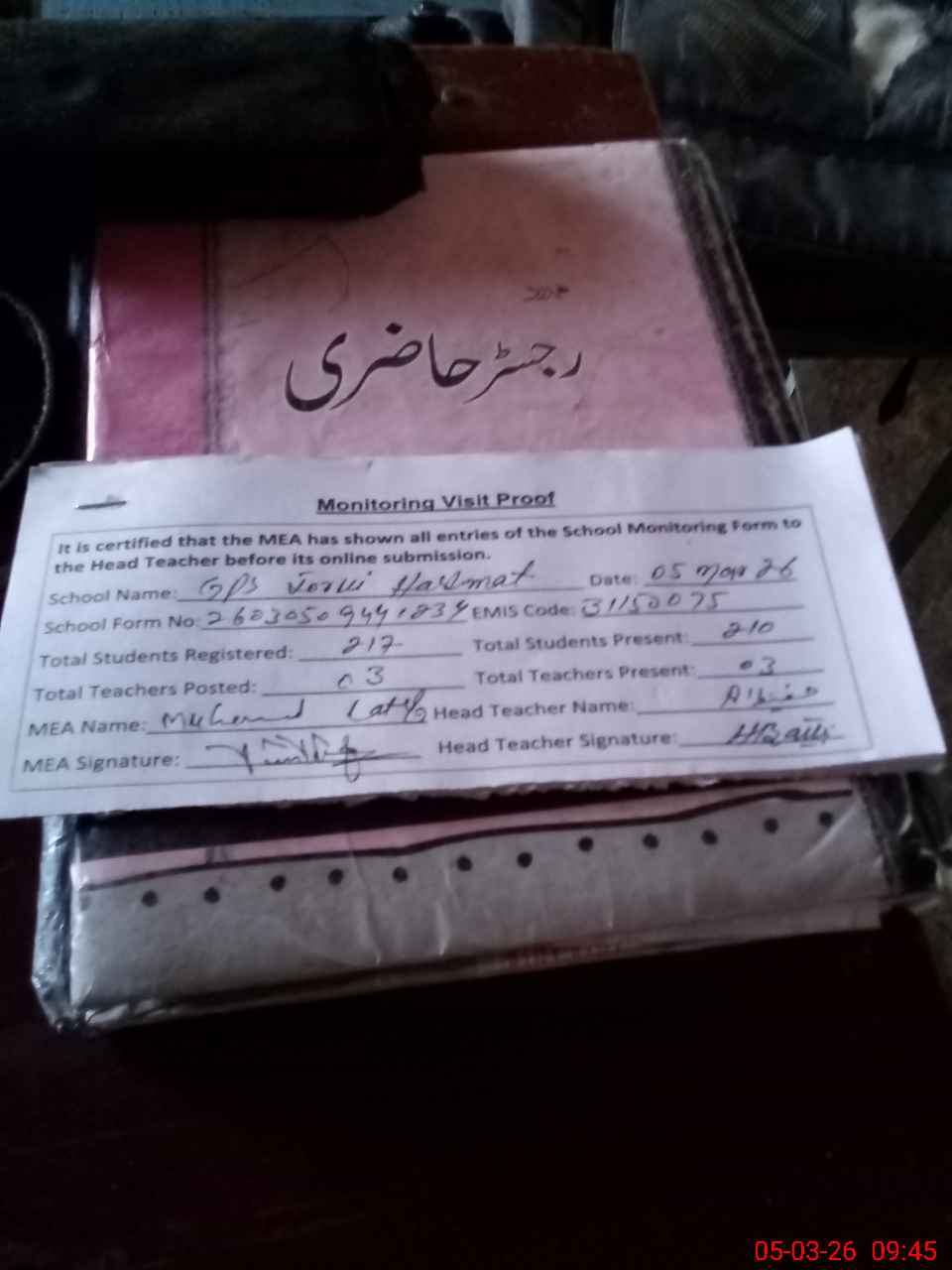 | Attendance Register | Head Teacher | MEA with School | Visit Proof |