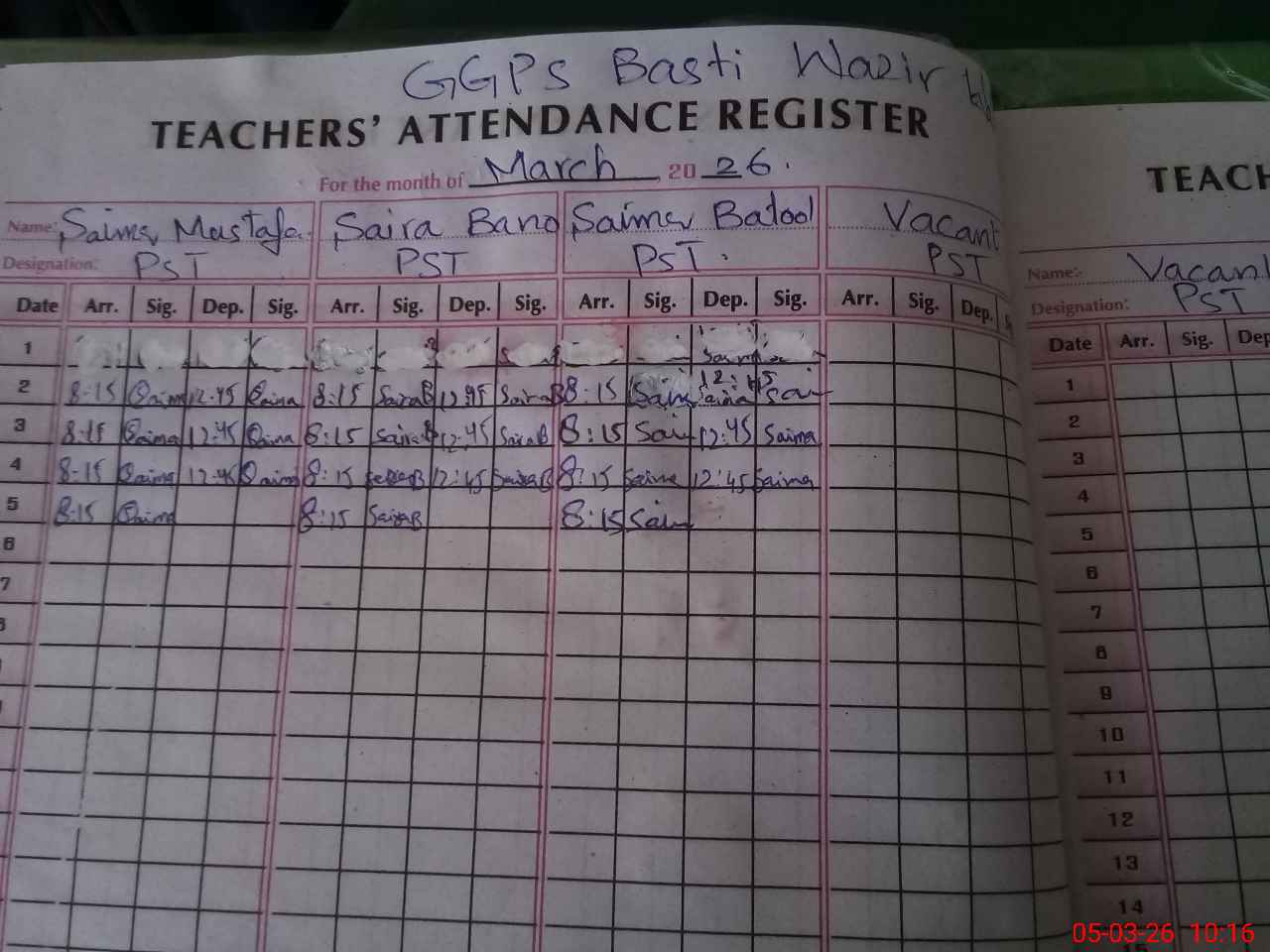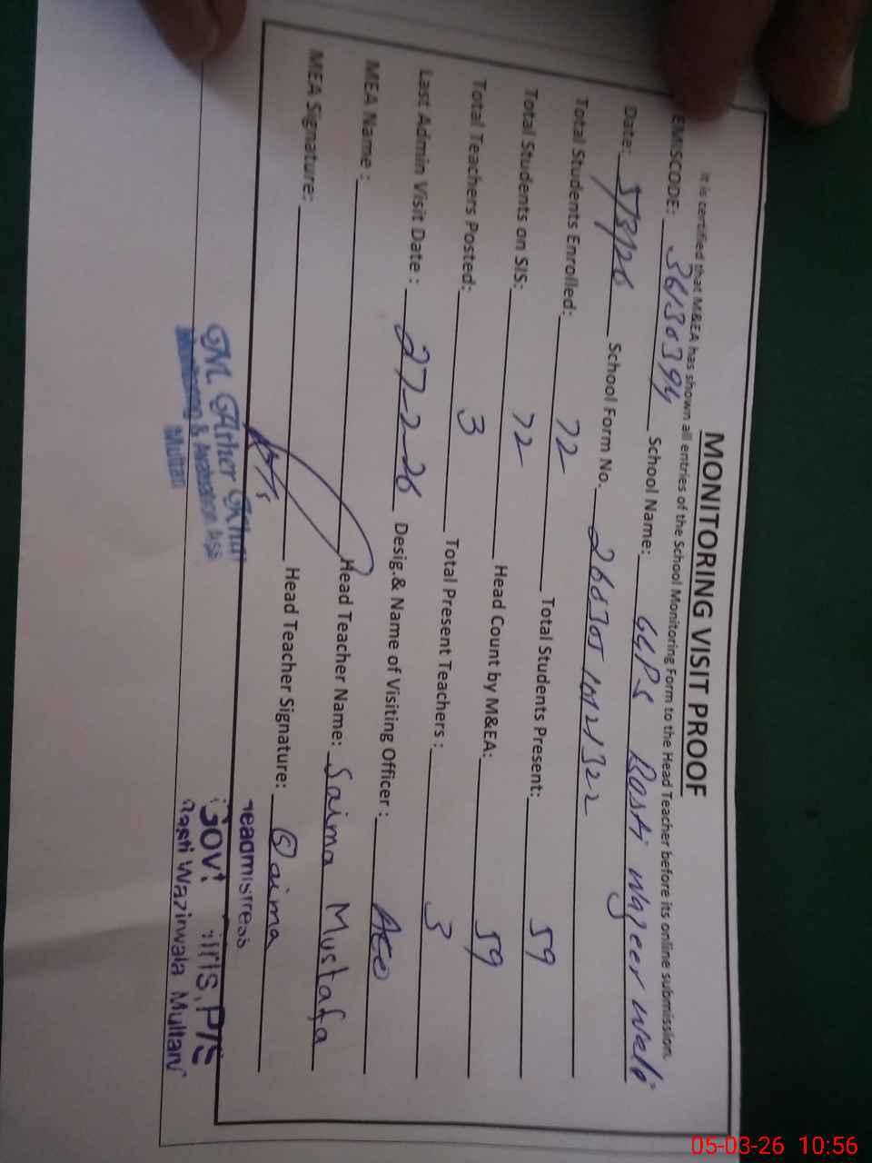 | Name: SA**** MU**** Designation: (School Headmaster's/Headmistress's) PST Phone/Cell Number: 03**** |