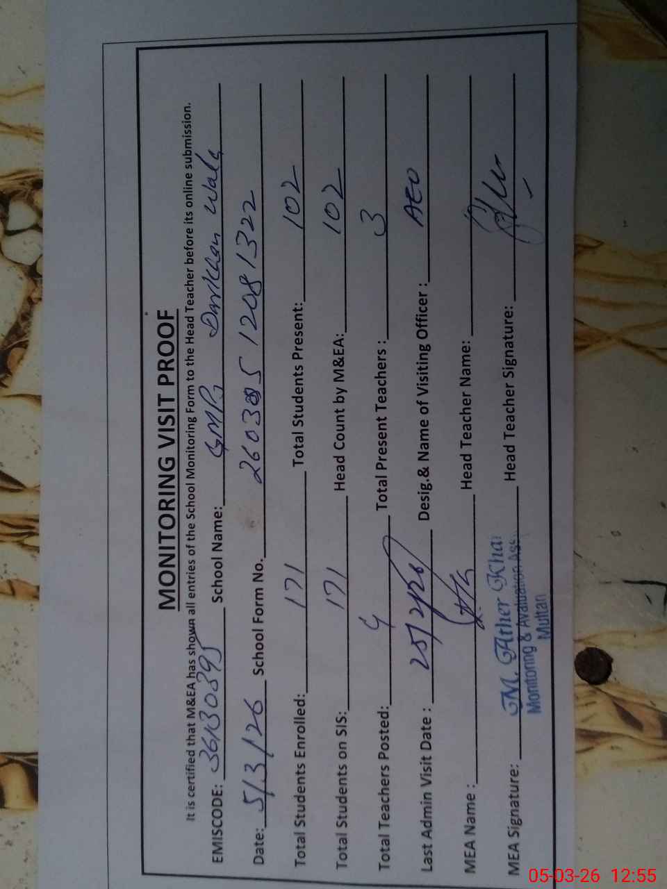 | Attendance Register | Head Teacher | MEA with School | Visit Proof |