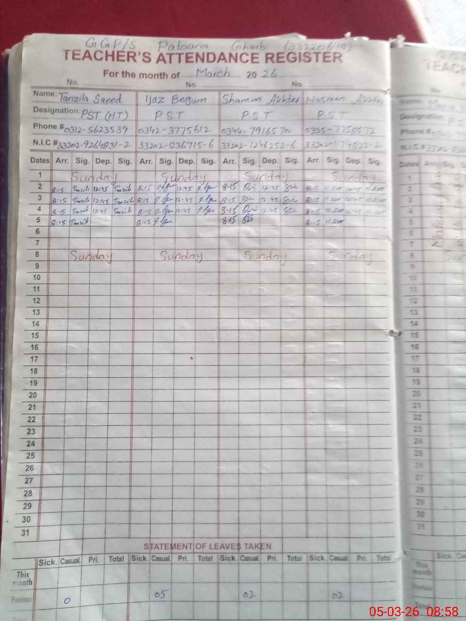 | 33**** | Ma**** Kh**** | PST Science/Maths | Regular | 0 | 0 | 0 | 0 | 0 | 0 | 0 | 0 | 0 | Maternity |