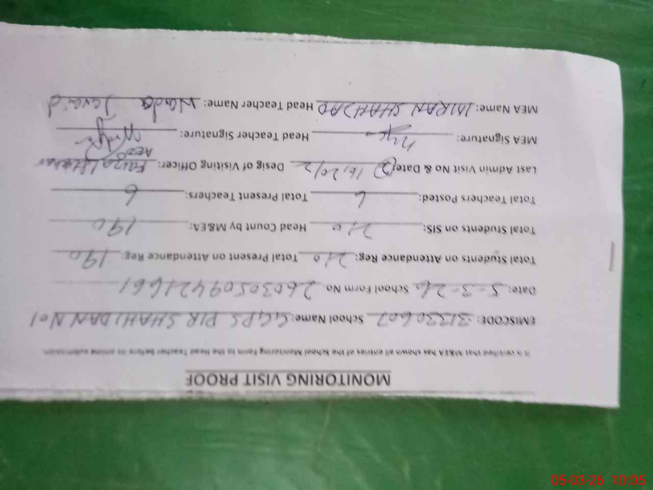 | Attendance Register | Head Teacher | MEA with School | Visit Proof |