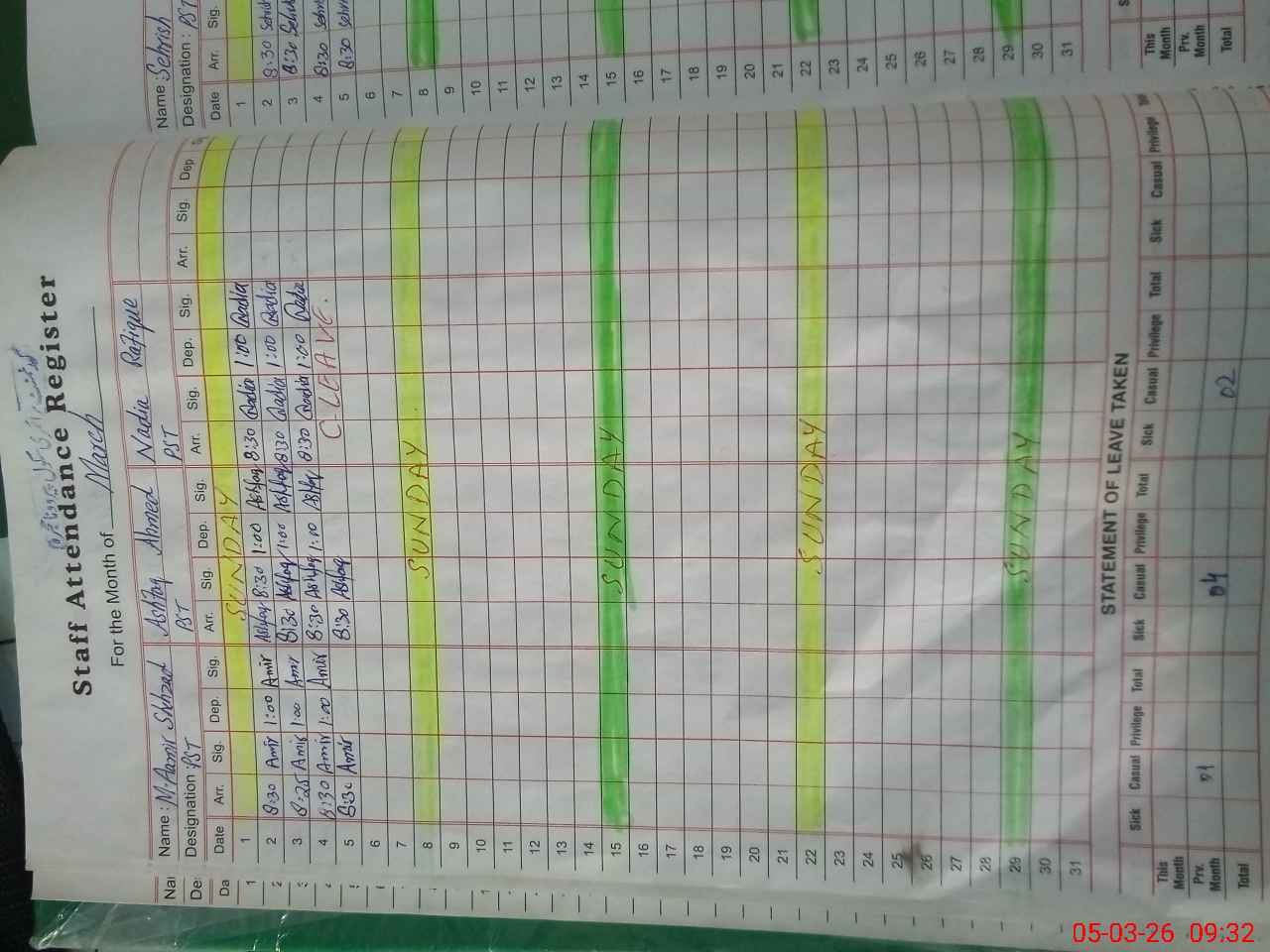 | CNIC | Full Name | Designation | R/C | Absence During Last Calender Month |