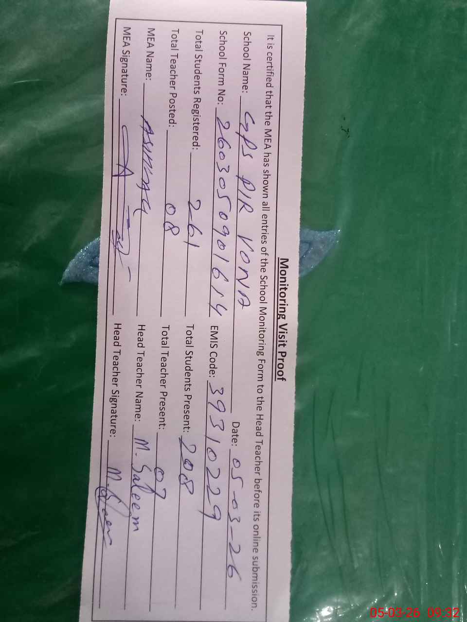 | Attendance Register | Head Teacher | MEA with School | Visit Proof |