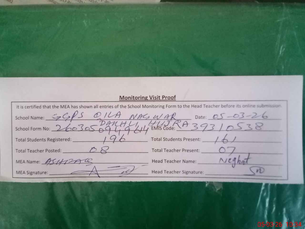| Attendance Register | Head Teacher | MEA with School | Visit Proof |