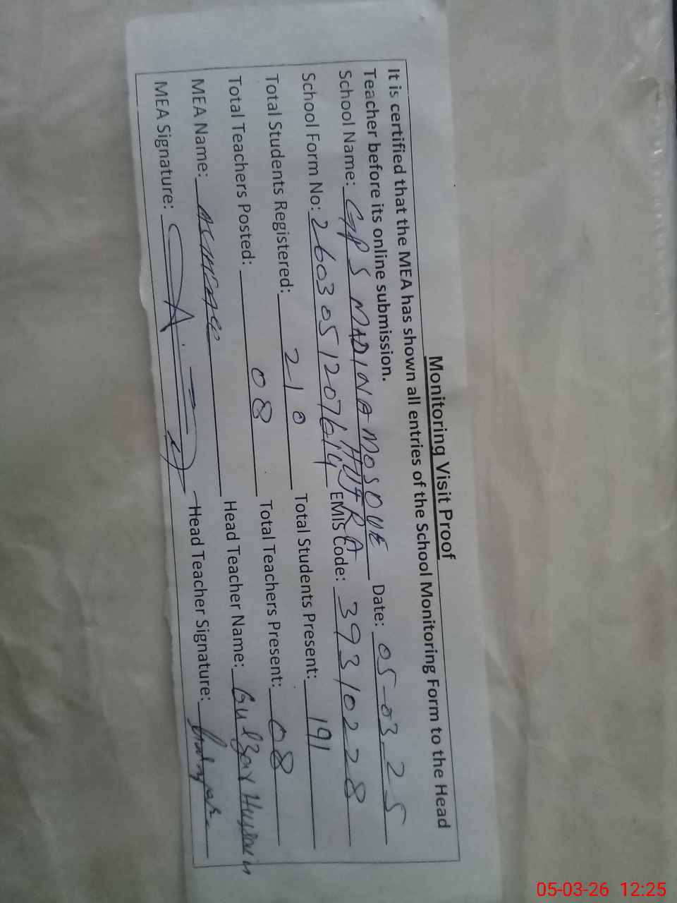| Attendance Register | Head Teacher | MEA with School | Visit Proof |