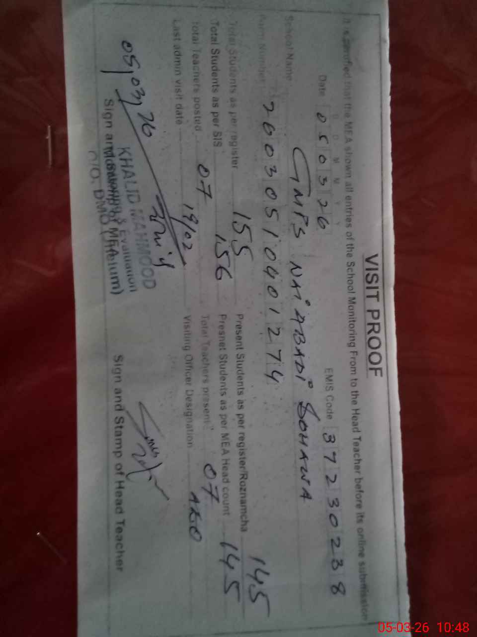 | Certified that this School was Inspected by the Undersigned MEA/DMO Today and the Information Stated Above is as Per Record. | |||||