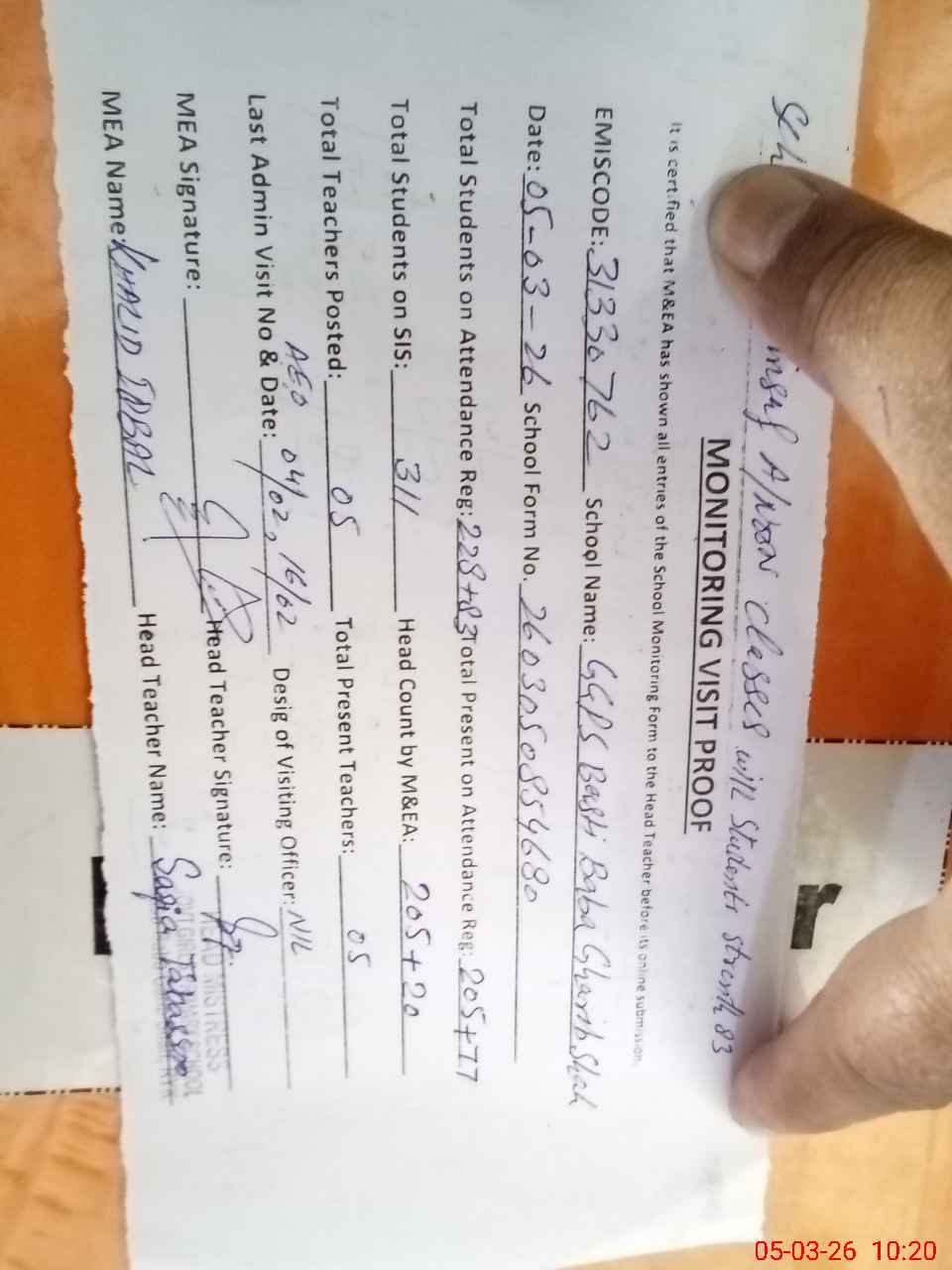 | Attendance Register | Head Teacher | MEA with School | Visit Proof |
