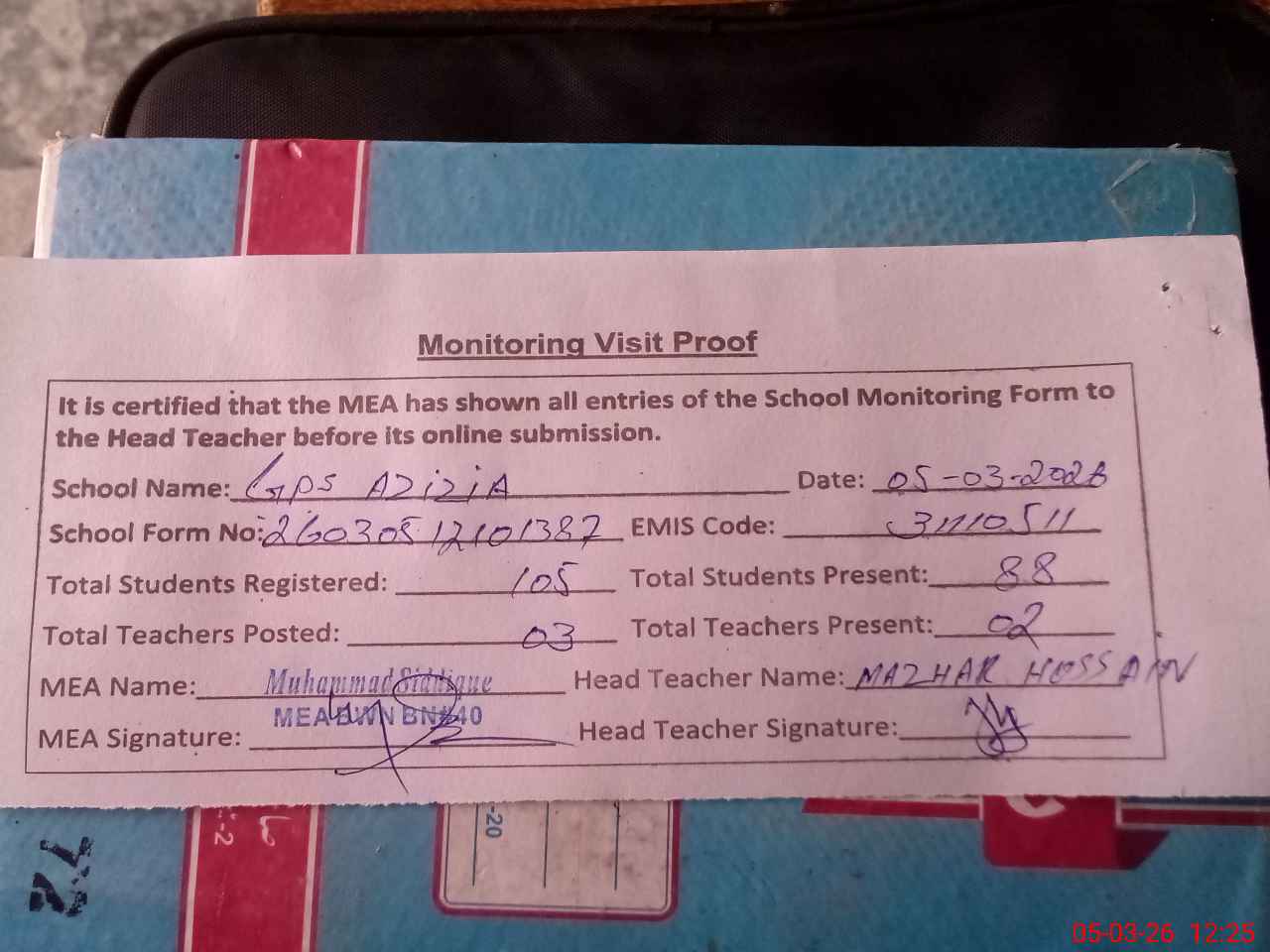 | Attendance Register | Head Teacher | MEA with School | Visit Proof |
