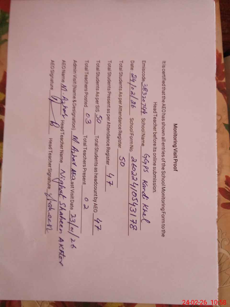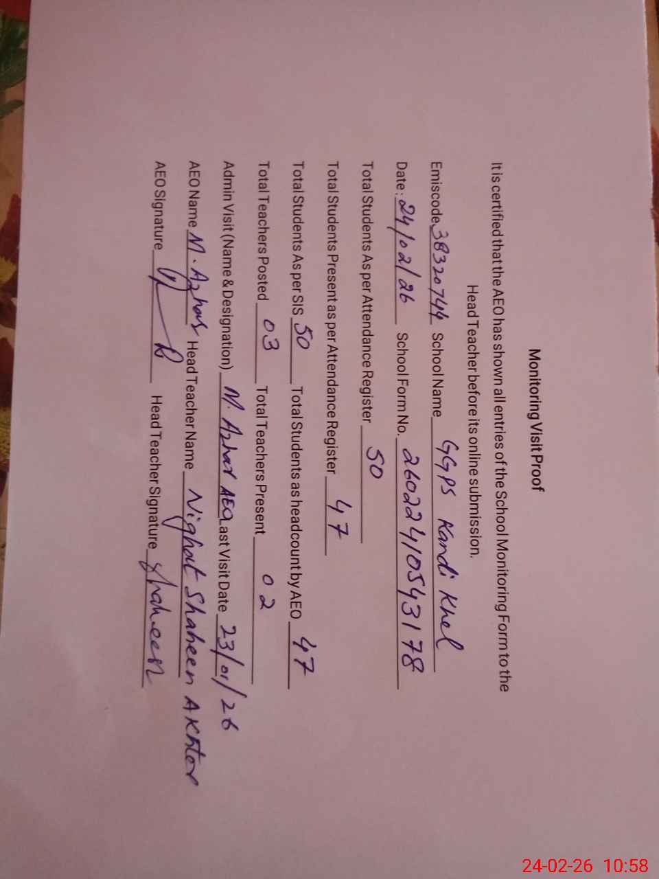 | Attendance Register | Head Teacher | MEA with School | Visit Proof |
