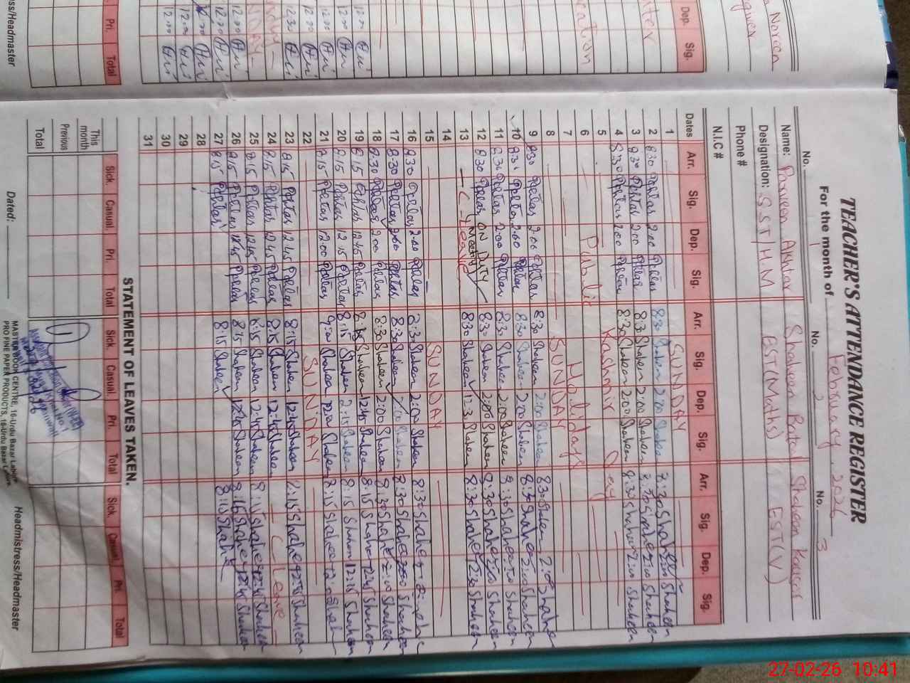 | CNIC | Full Name | Designation | R/C | Absence During Last Calender Month |