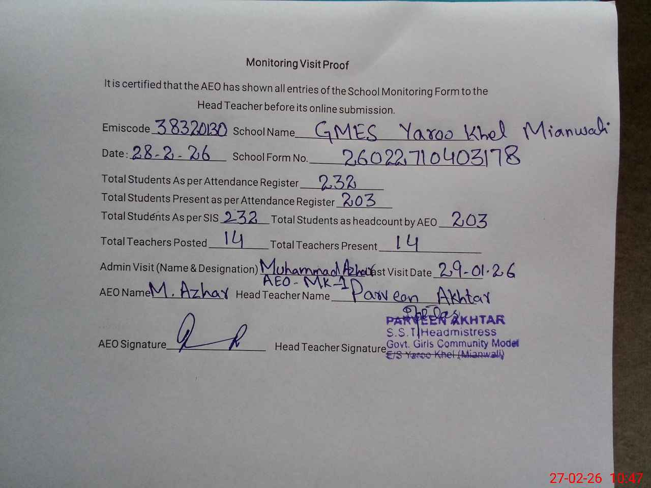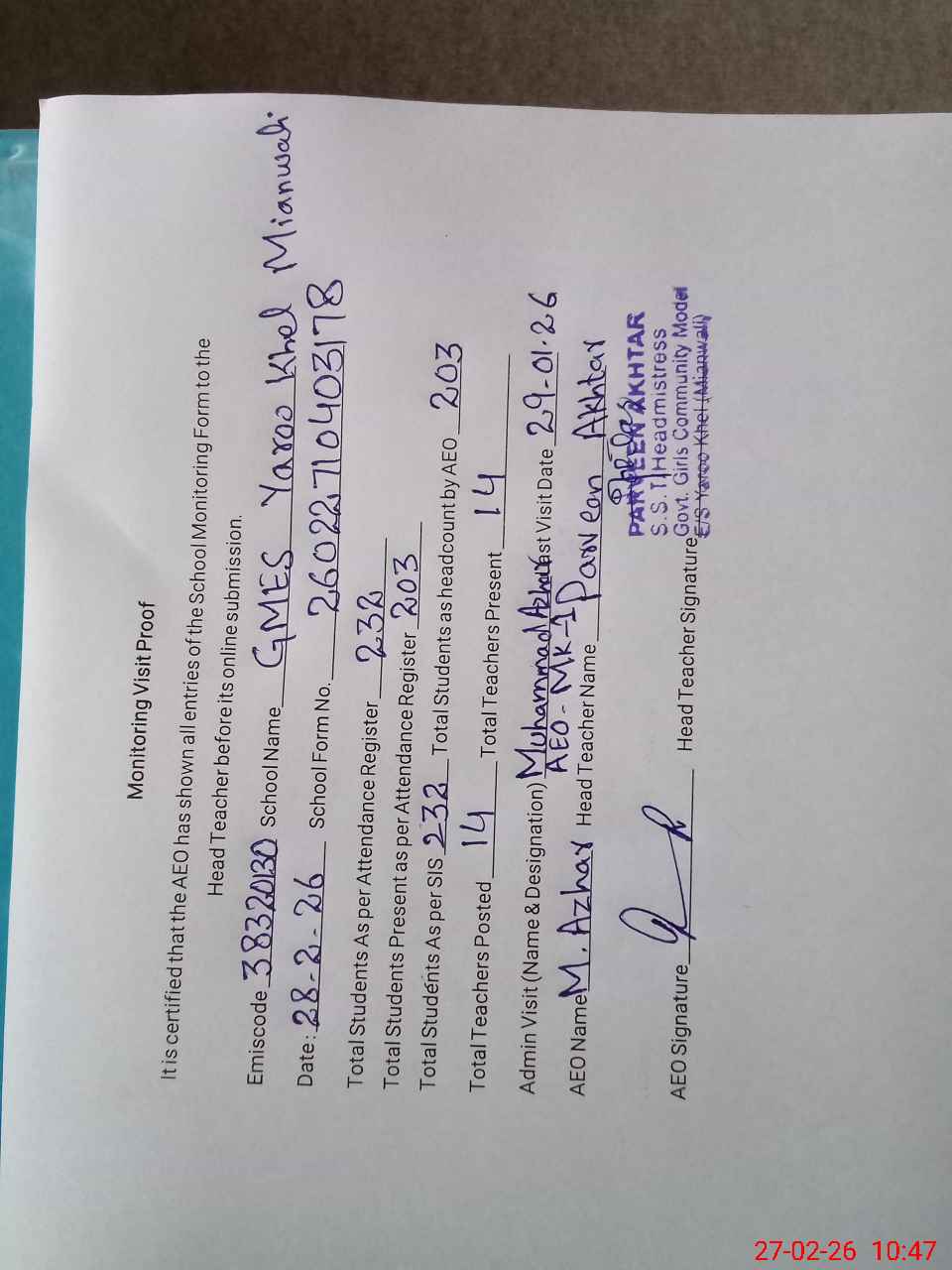 | Attendance Register | Head Teacher | MEA with School | Visit Proof |