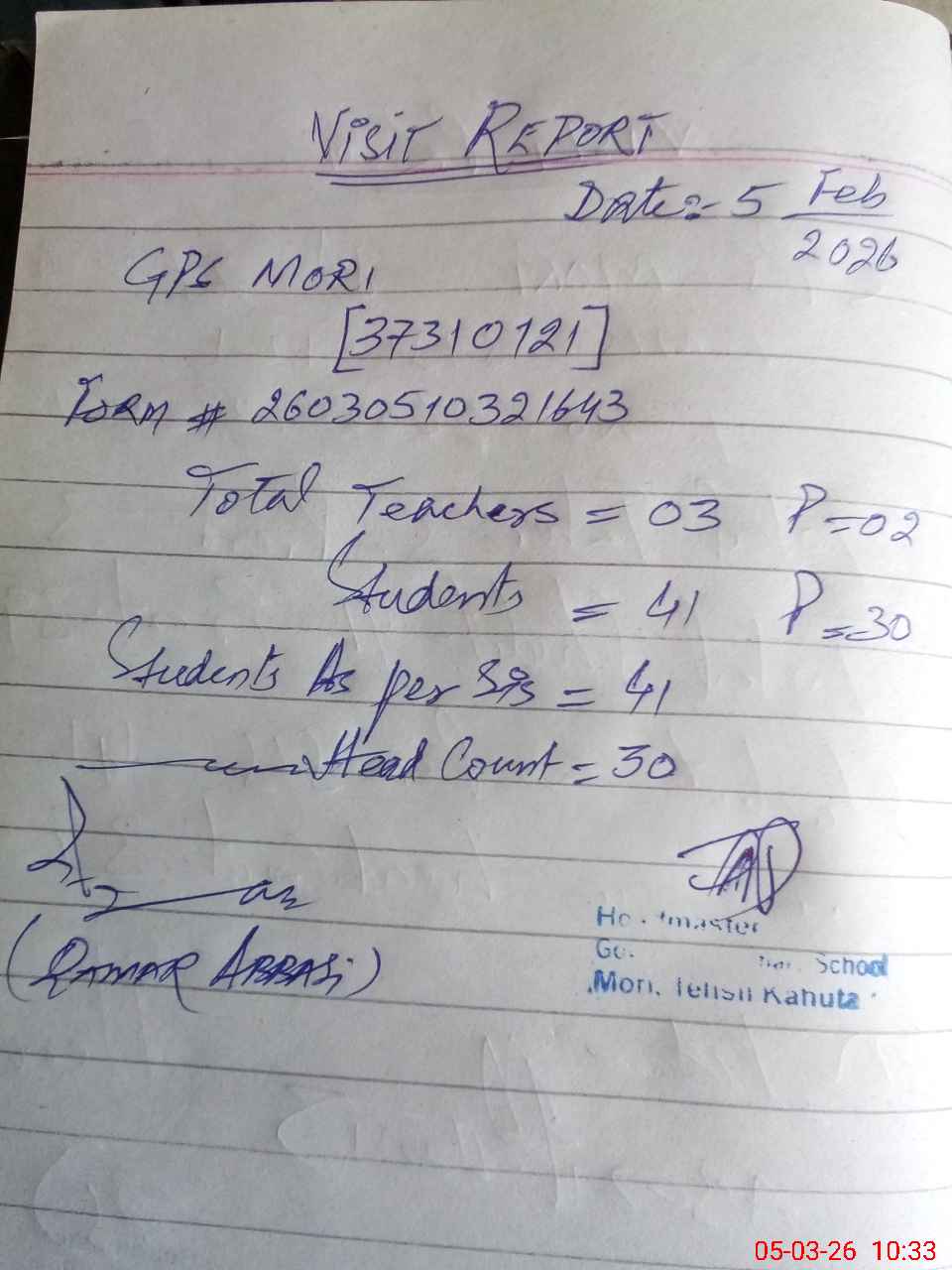 | Attendance Register | Head Teacher | MEA with School | Visit Proof |