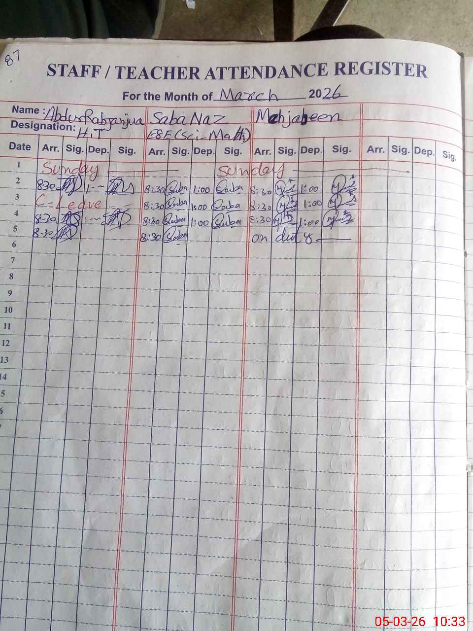 | Leave | Duty | Absent | Maternity | Medical | Ex- Pak |