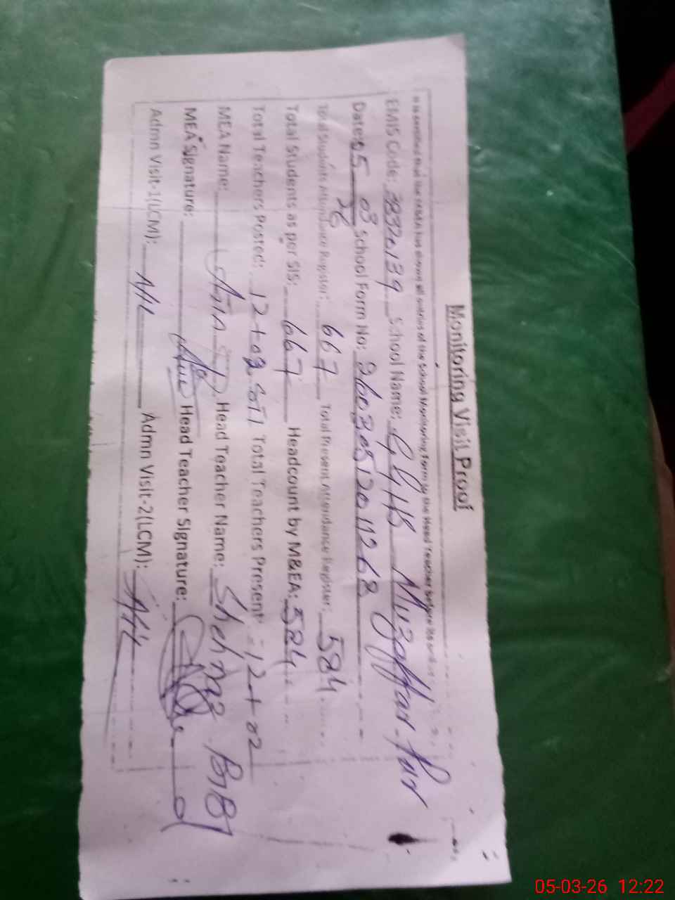 | Attendance Register | Head Teacher | MEA with School | Visit Proof |