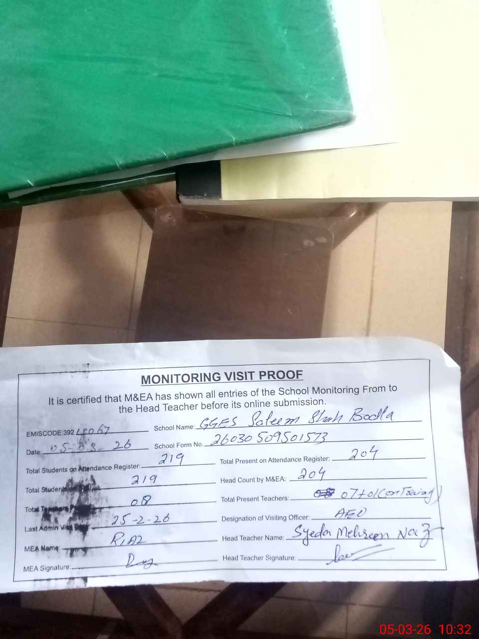 | Attendance Register | Head Teacher | MEA with School | Visit Proof |