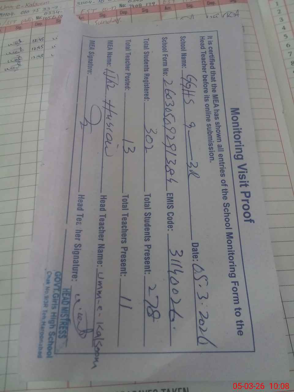 | Attendance Register | Head Teacher | MEA with School | Visit Proof |