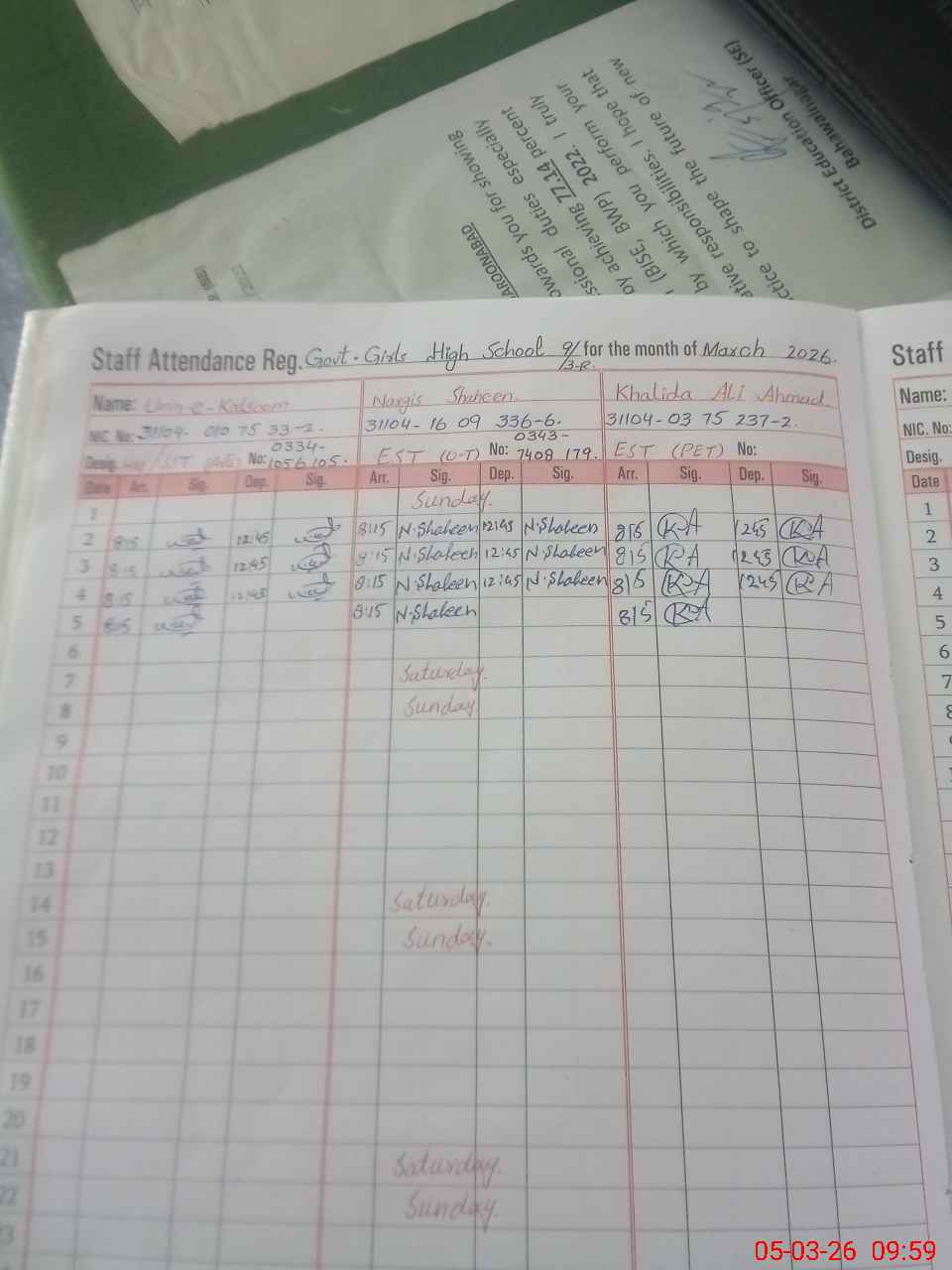 | CNIC | Full Name | Designation | R/C | Absence During Last Calender Month |