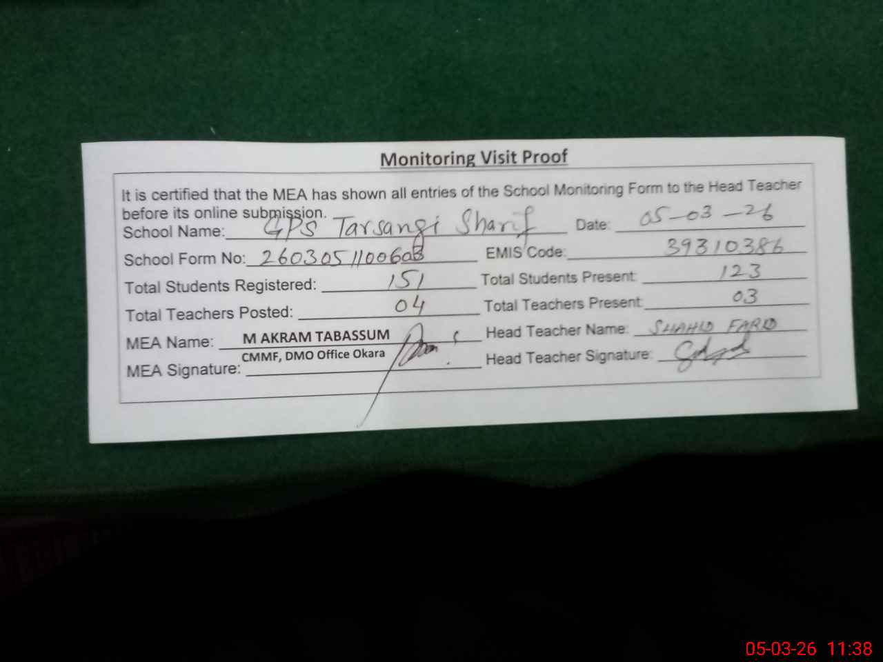 | Monitoring Date: 05-03-2026 | Start Time: 05-03-2026 11:00 AM | End Time: 05-03-2026 11:38 AM | Name of MEA: MU**** AK**** TA**** | |