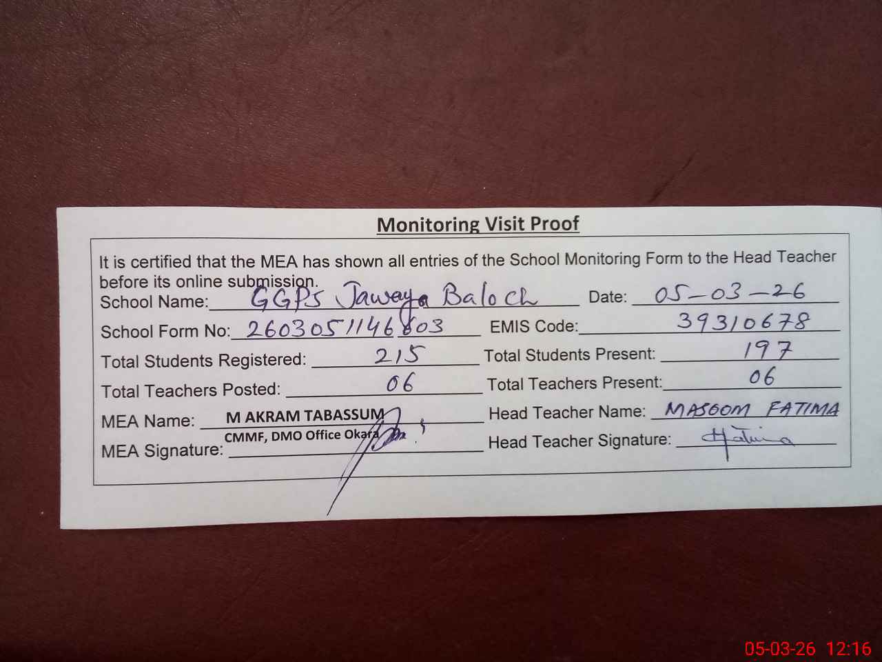 | Attendance Register | Head Teacher | MEA with School | Visit Proof |