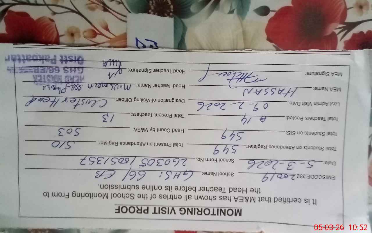 | Certified that this School was Inspected by the Undersigned MEA/DMO Today and the Information Stated Above is as Per Record. | |||||