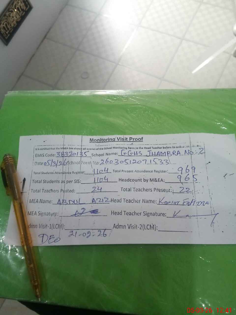 | Attendance Register | Head Teacher | MEA with School | Visit Proof |