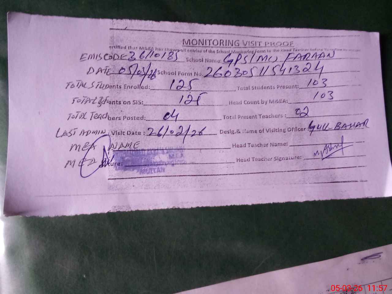 | Attendance Register | Head Teacher | MEA with School | Visit Proof |
