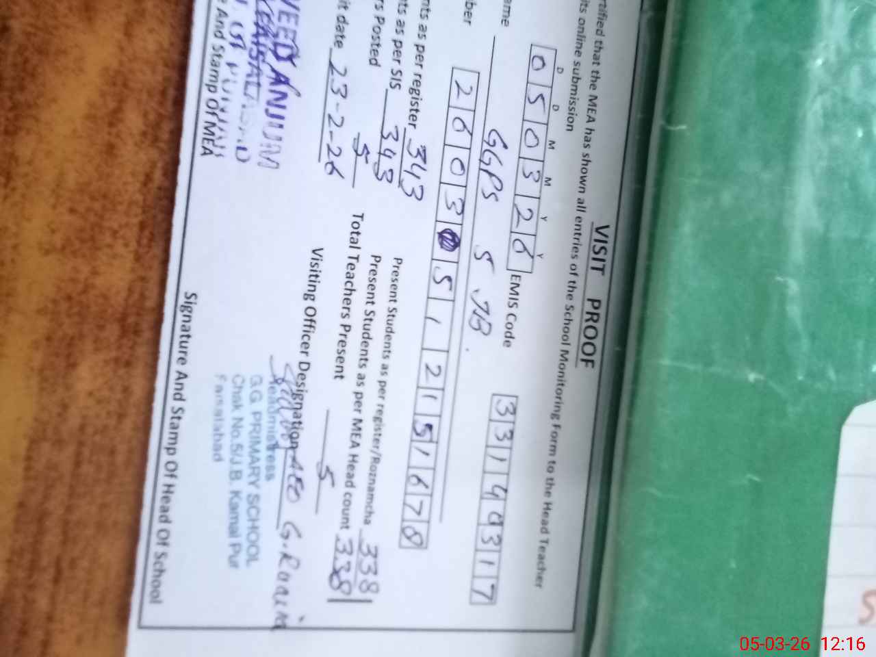 | Attendance Register | Head Teacher | MEA with School | Visit Proof |