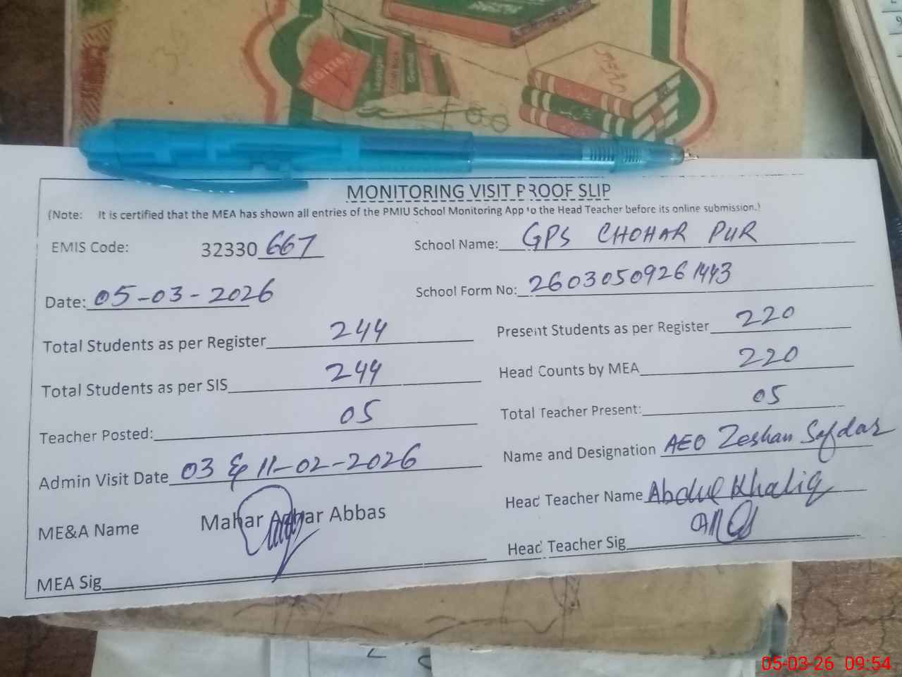 | Attendance Register | Head Teacher | MEA with School | Visit Proof |