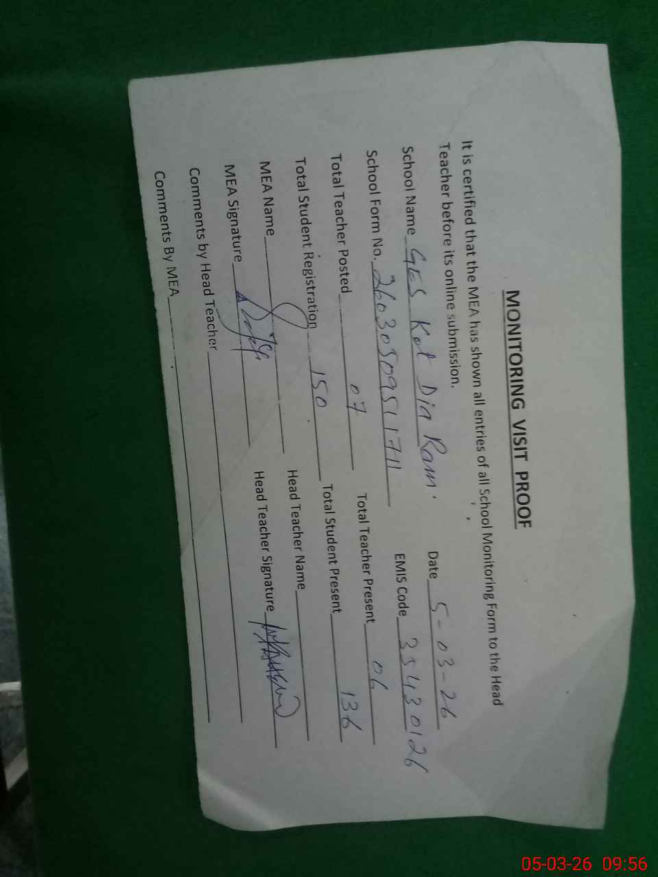 | Attendance Register | Head Teacher | MEA with School | Visit Proof |