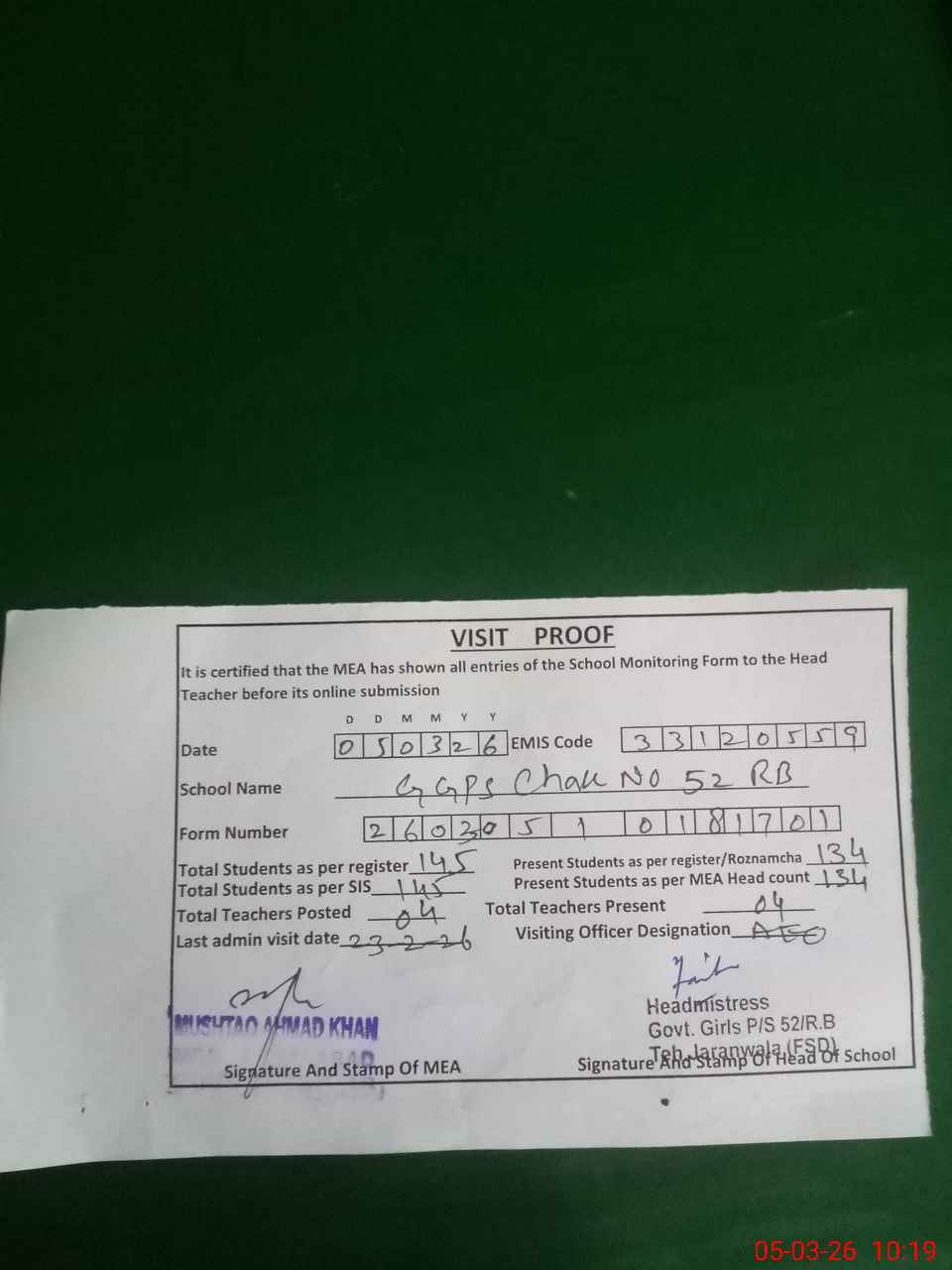 | Attendance Register | Head Teacher | MEA with School | Visit Proof |