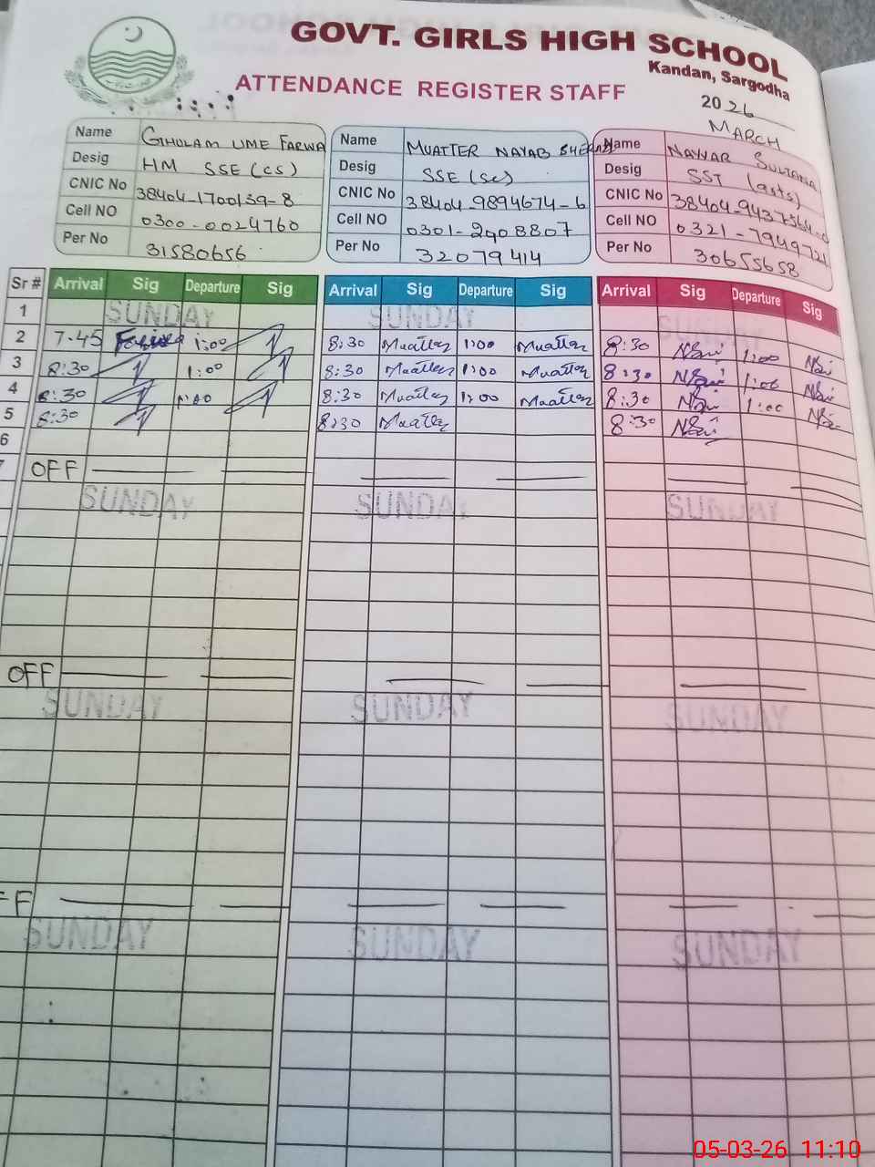 | CNIC | Full Name | Designation | R/C | Absence during last cal. month |
