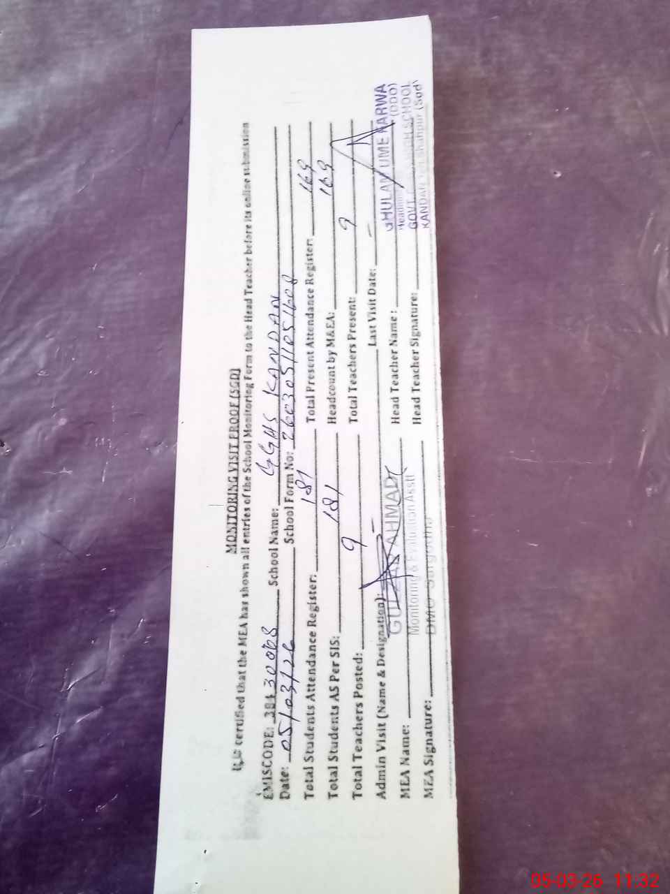 | Attendance Register | Head Teacher | MEA with School | Visit Proof |