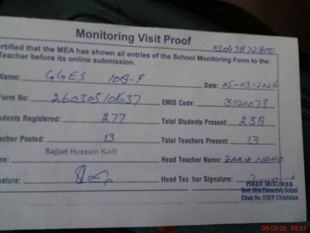 | EMIS Code: 31120079 | Name of School: GGES CHAK NO 108/F | |||