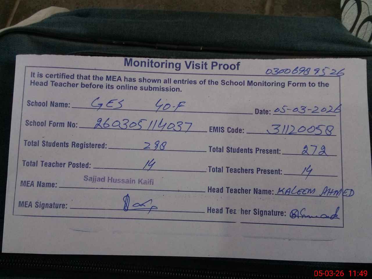 | Attendance Register | Head Teacher | MEA with School | Visit Proof |
