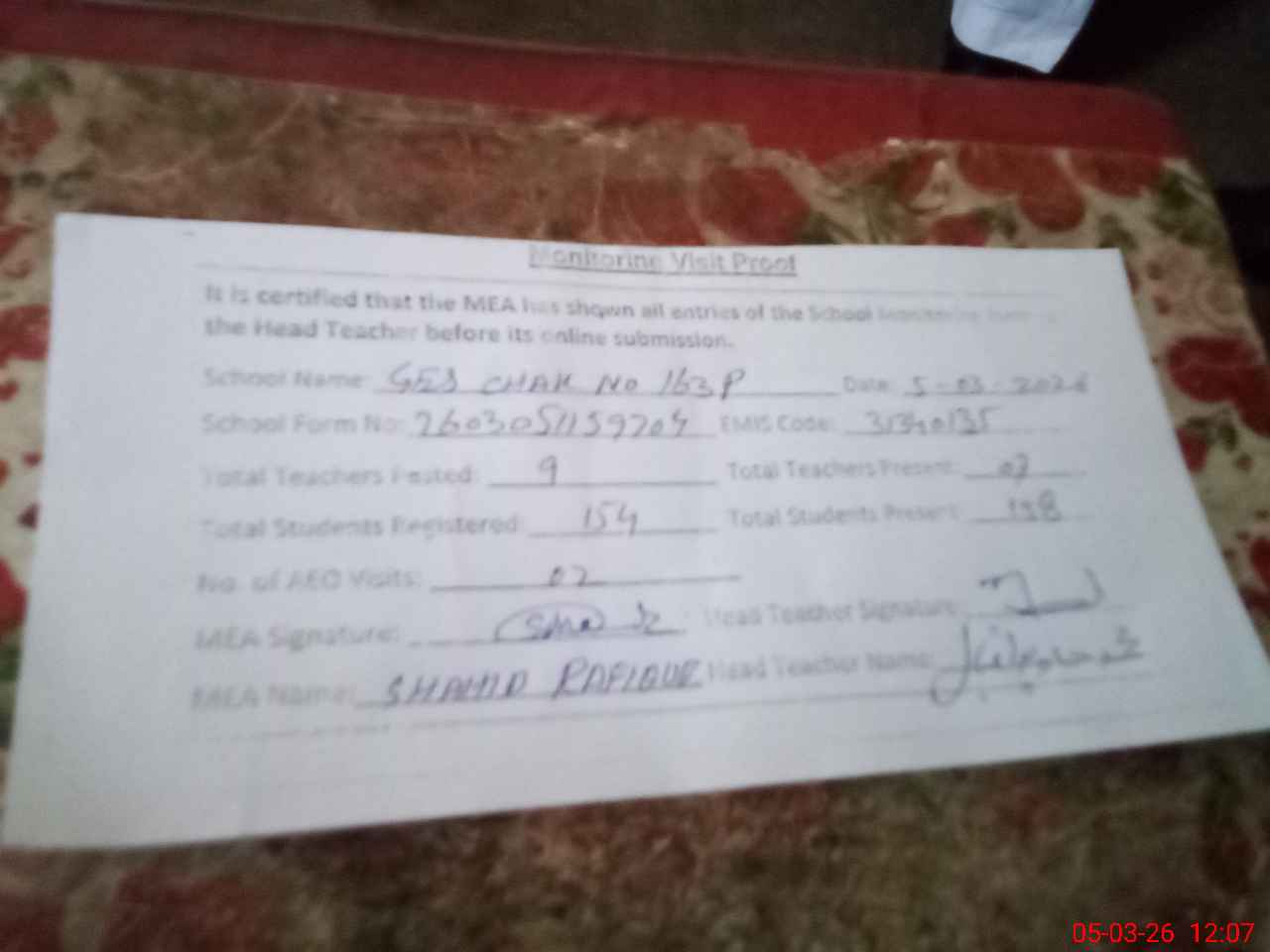 | Attendance Register | Head Teacher | MEA with School | Visit Proof |