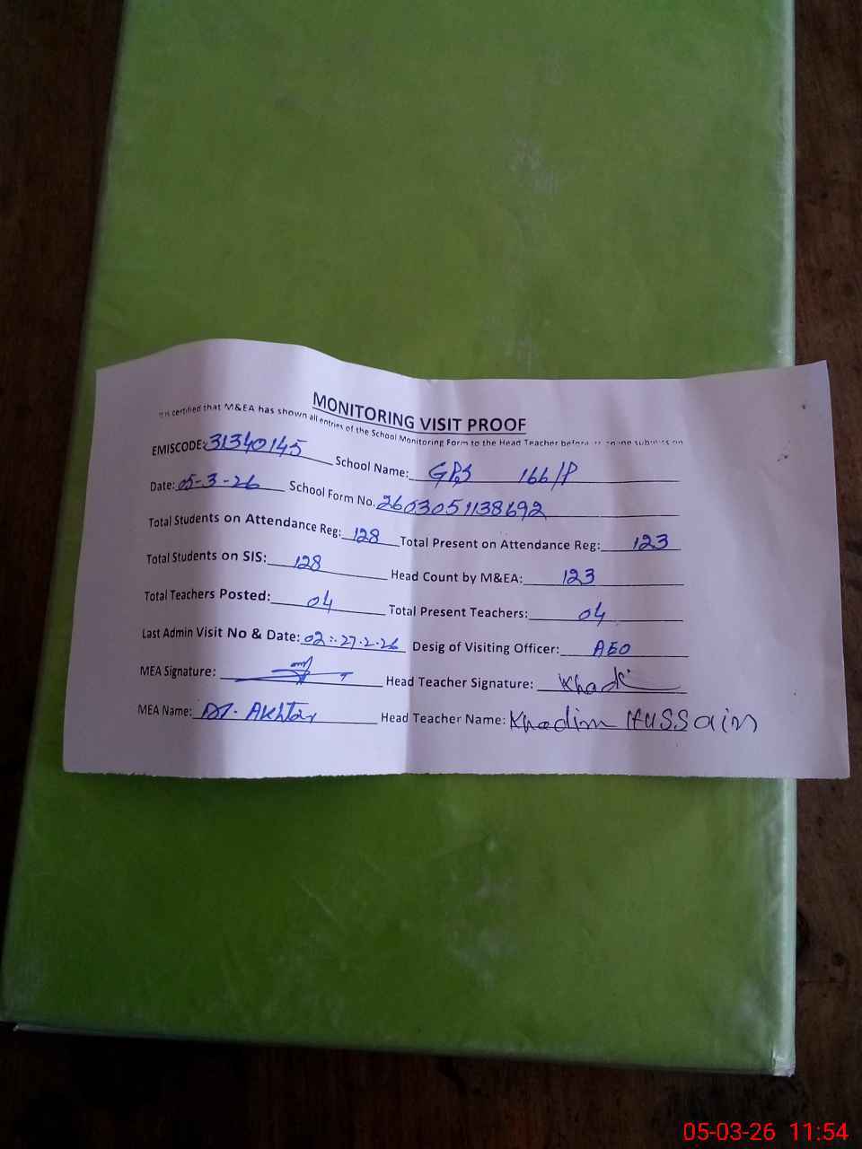 | Attendance Register | Head Teacher | MEA with School | Visit Proof |