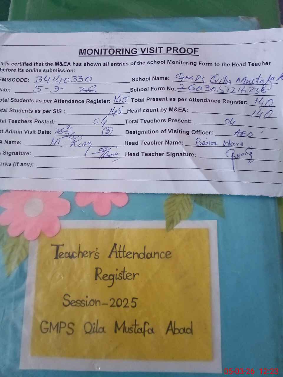 | Attendance Register | Head Teacher | MEA with School | Visit Proof |