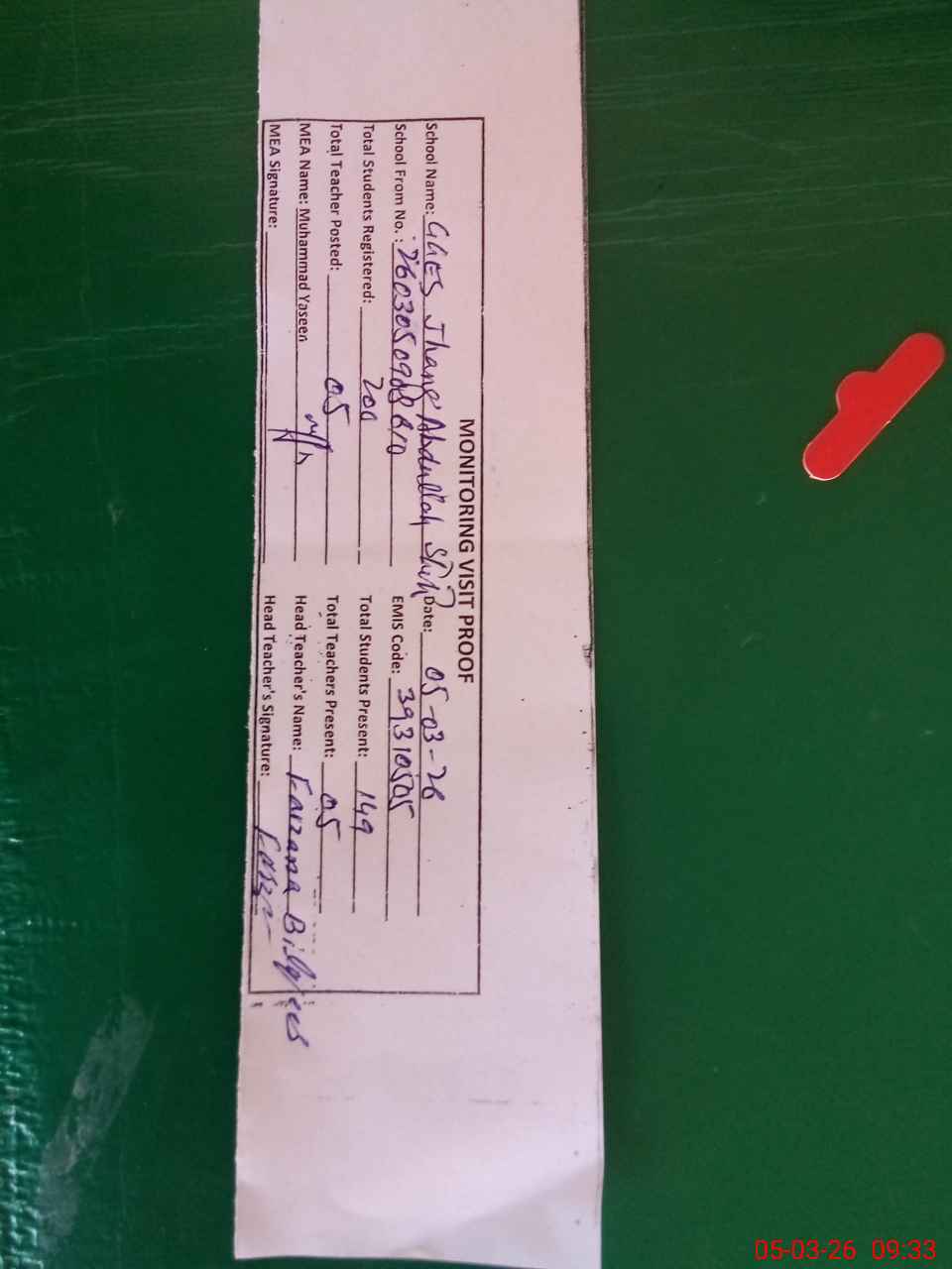 | Attendance Register | Head Teacher | MEA with School | Visit Proof |