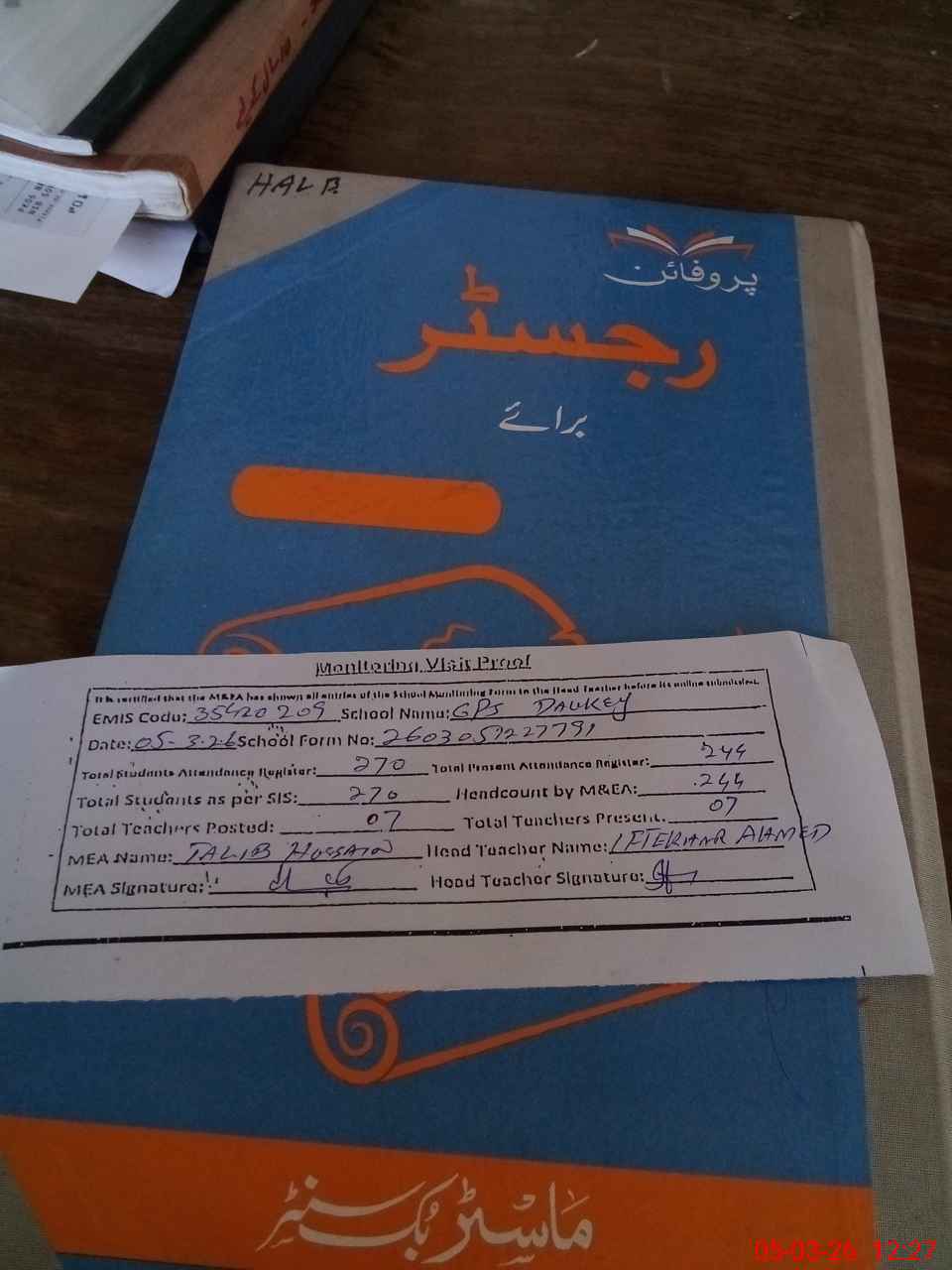 | Attendance Register | Head Teacher | MEA with School | Visit Proof |