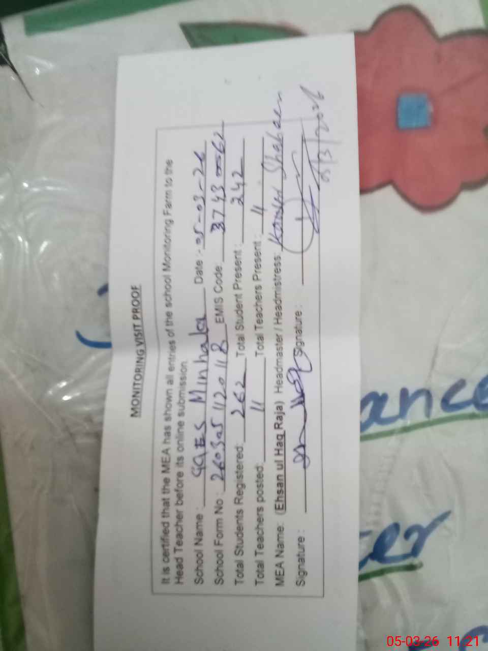 | Attendance Register | Head Teacher | MEA with School | Visit Proof |